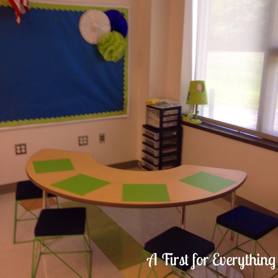 This is my guided reading table. The chairs I purchased from Target last year on clearance. On the table, the green placements are vinyl. I purchased a roll of vinyl from Amazon. Last year I used wipe off wall decals that were circle shaped. I loved them! The kids could write on them with wipe-off markers and it came off really easily. They are rather pricey - $20 for 4. This year I am experimeting with a roll of vinyl that I cut into 12 inch squares since it was much cheaper at $23 for a whole roll. I'm not sure yet if they are wipe-off...guess we'll find out! We practice word blending, word families, etc on these. Last year, I wrote "somebody...wanted....but...so" (one word on each) for story retell practice. The bulletin board behind my guided reading table is all Schoolgirl Style materials. This will be our focus board. I bought some great products during the TPT sale that will be great for this board!