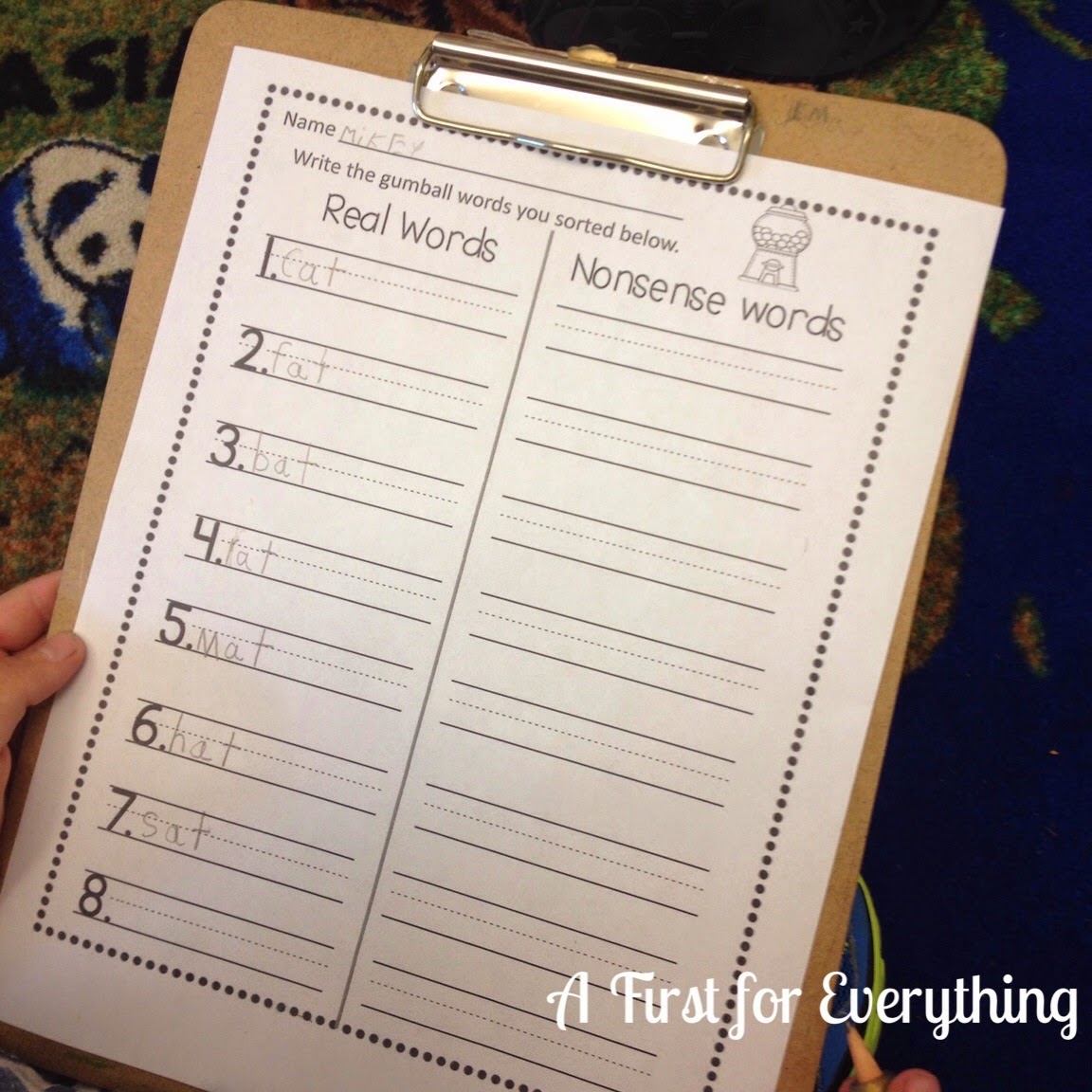 We sorted "gumballs" by real -at word and nonsense -at words.