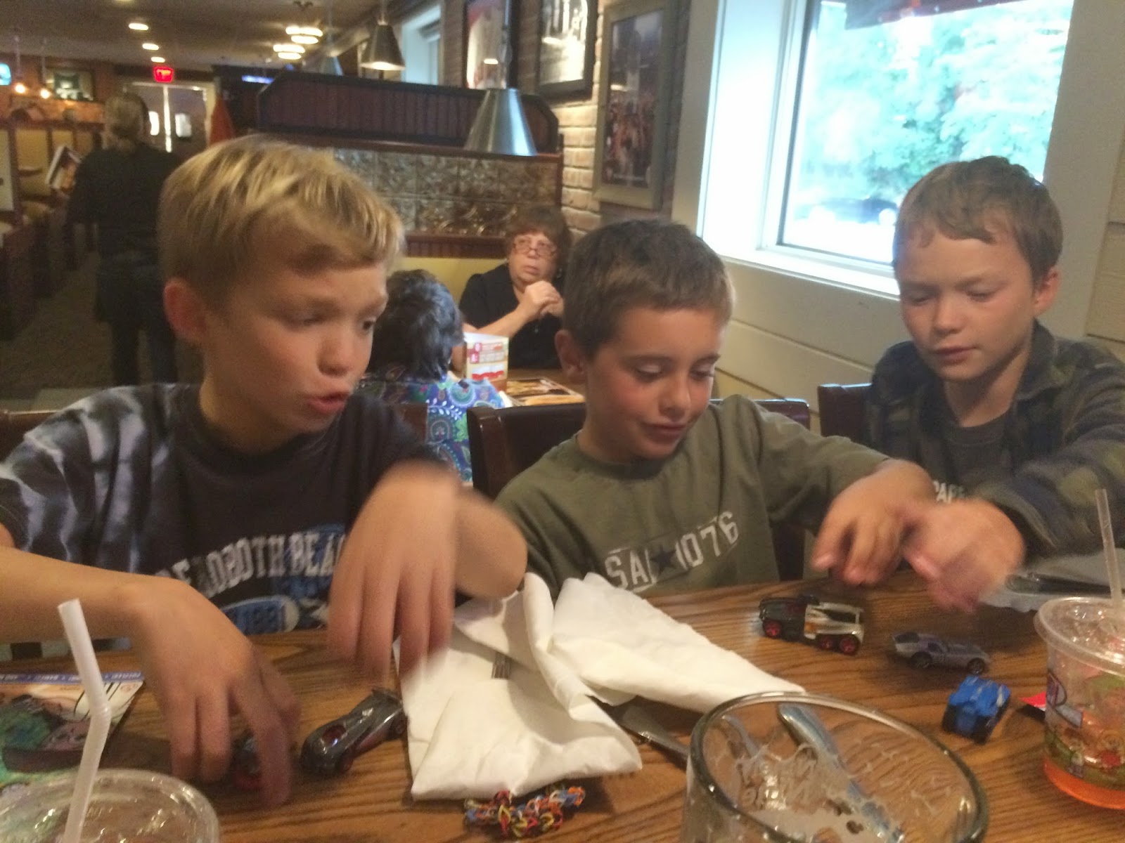 I don't know what the deal is this year but I have been dog tired by week's end. Usually I have gotten into the swing of things by now and I don't fatigue as easy. Maybe I'm just getting older. Anywhoose.....when the hubby suggested going out for dinner I couldn't say yes fast enough. Here are our little terrors at dinner.