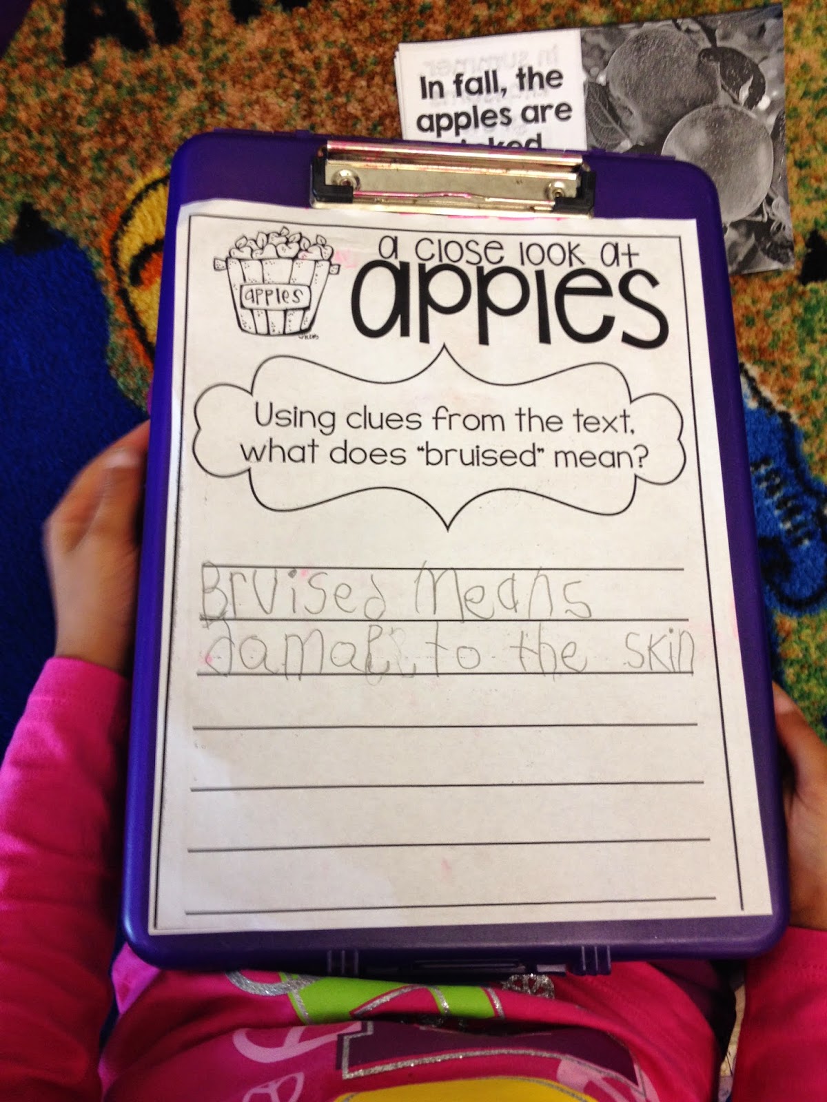We also enjoyed doing a close read about apple picking. I don't know what it is about highlighters but every time they get to use them, the kiddos squeal with delight. We highlighted key details and vocabulary from the text and answered text dependent questions.