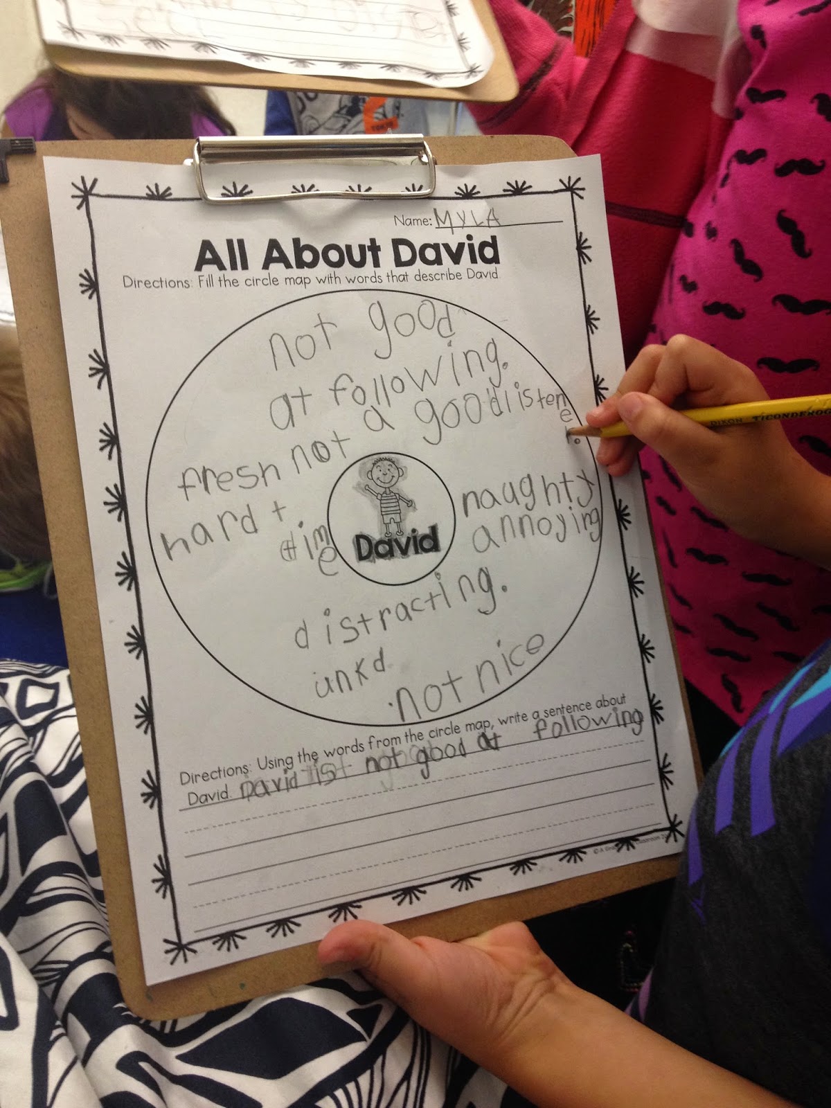 After reading the book we made a character map of David. Students used their clipboards to write their thoughts on David's personality on their own character map.