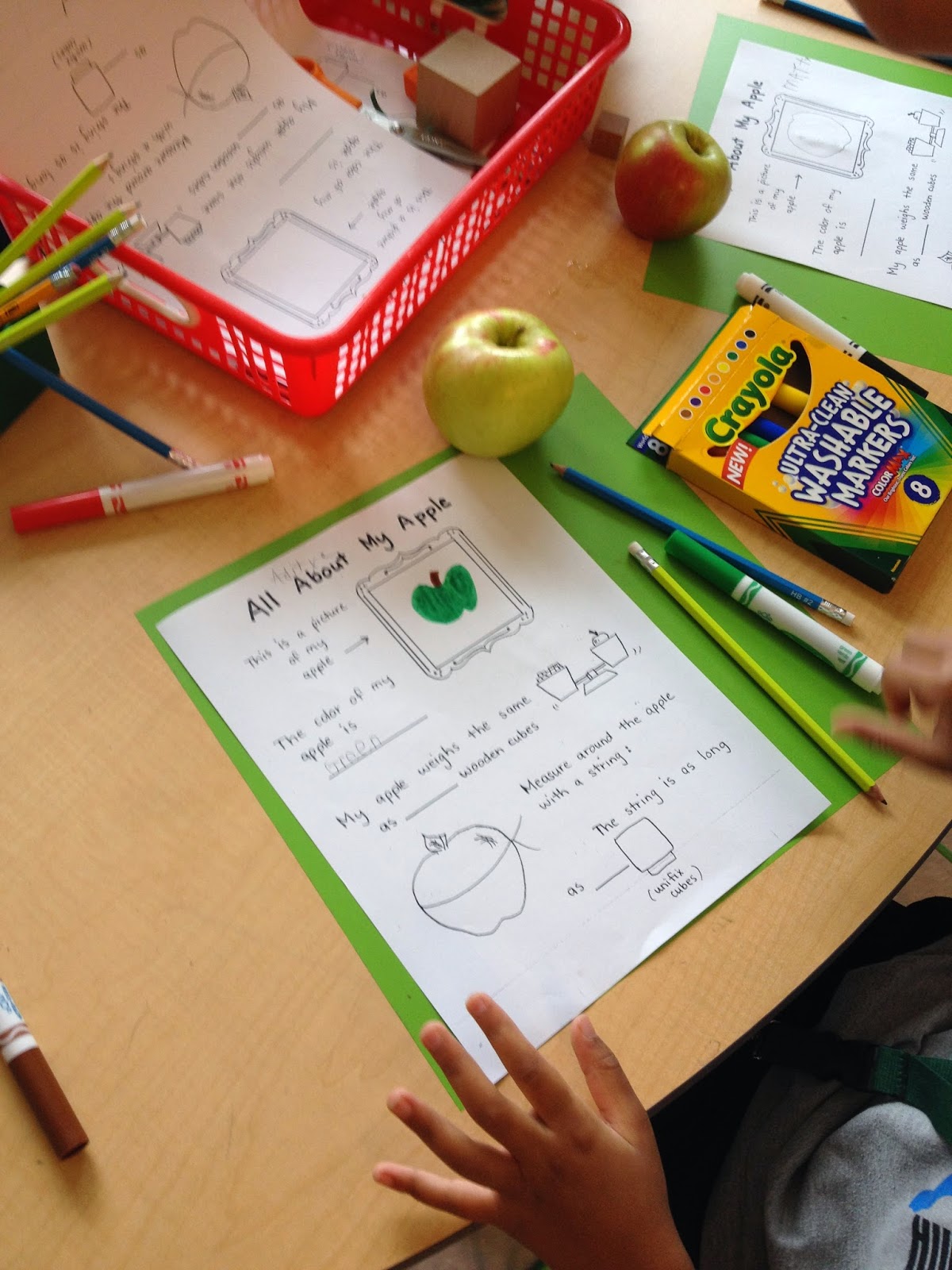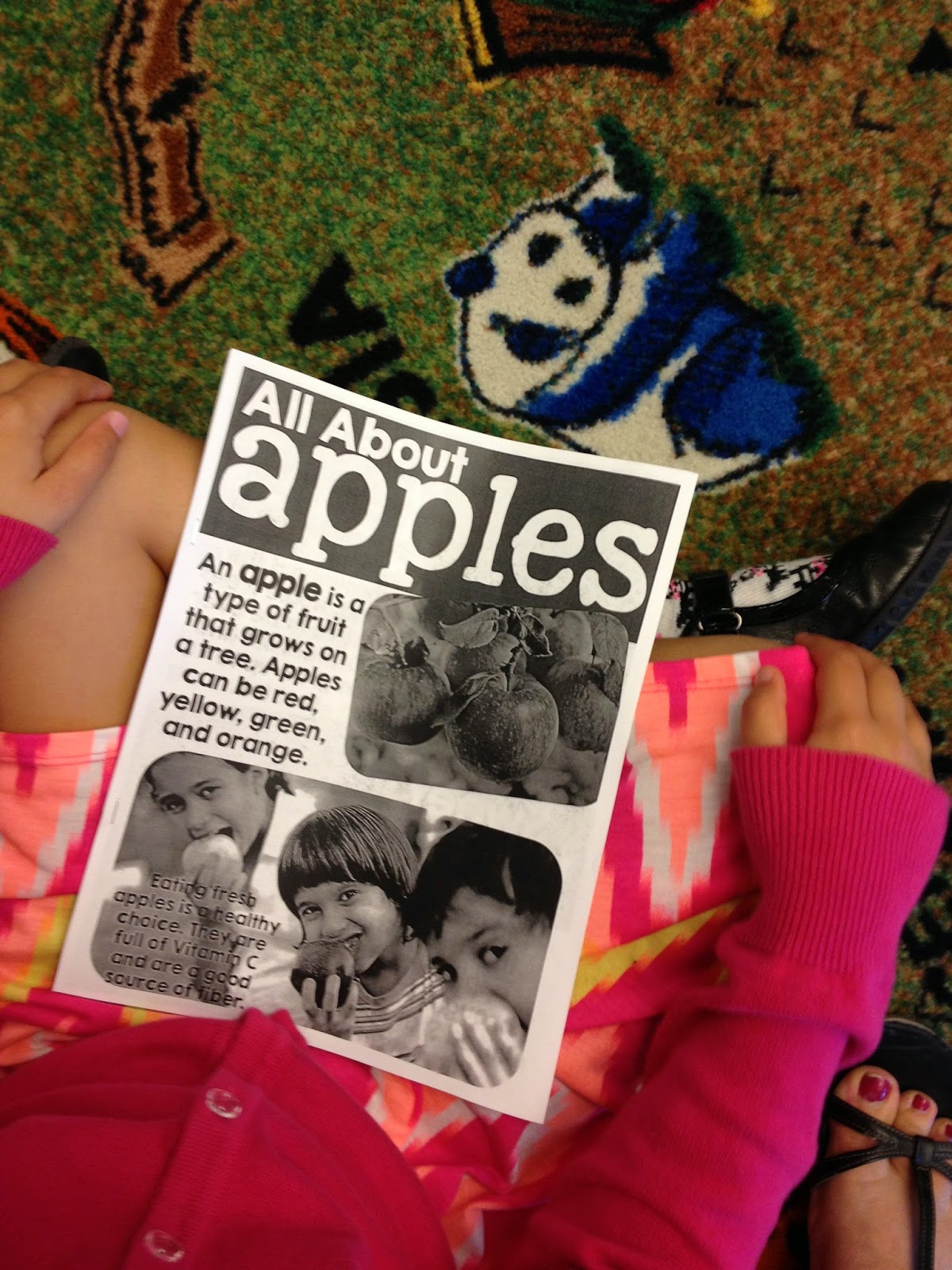 We had an apple activity day this week where parents came in to volunteer and we had various apple themed stations set up. Here are a few: