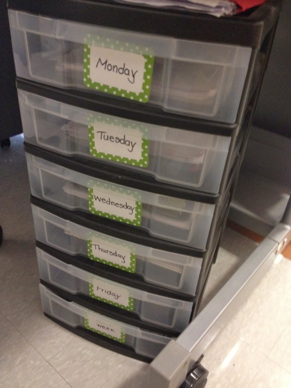 Perhaps the most handy and the most used organizational tool I have is this plastic six drawer file system that I keep under my desk. It is labeled with each day of the week and there is one extra bin that I use for extra morning week and extra worksheets. All the work that I have planned for the week goes into the these bins. When I walk in on Tuesday, I open the Tuesday drawer, pull out the morning work that I filed in there after photocopying it the week prior, and add it to the table. I then disperse homework into the mailboxes and put any other work that is in that drawer that we are going to use for the day, on my desk under my lesson planner to have ready for the day. Easy peezy!