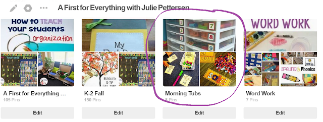 So then I saw some ideas on Pinterest for morning work using various manipulatives. Many teachers call this "Morning Tubs." I pinned a lot of Morning Tub ideas to a Pinterest board I appropriately titled.....wait for it....