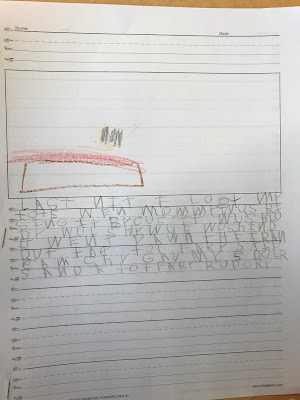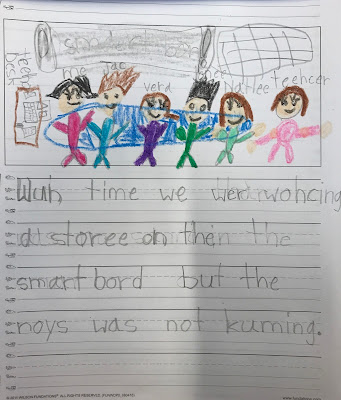 Wow! Look at this detailed drawing! Greg really know how to write a personal narrative. His story is about the day our SMARTboard wasn't working and had no sound. His story starts off with a good ending. He has great sight word spelling and his writing is neat and organized well. But.....his story just stopped. Oh no! Greg, you're leaving us hanging. We need to know what happened. Was the SMARTboard fixed? Your story needs an ending.